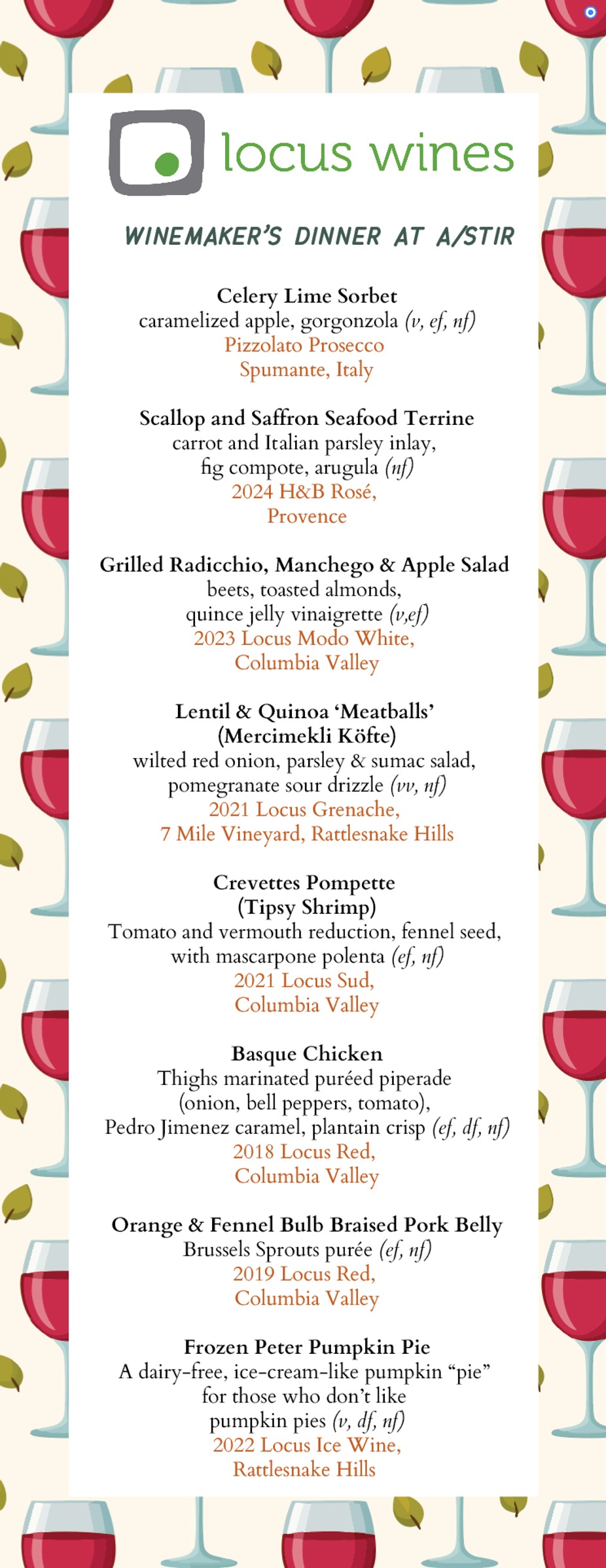 The dinner is $175 per person including gratuity. You are a Locus Wine Club member? You get a $25 discount with a promo code (it will come to your wine club membership email).